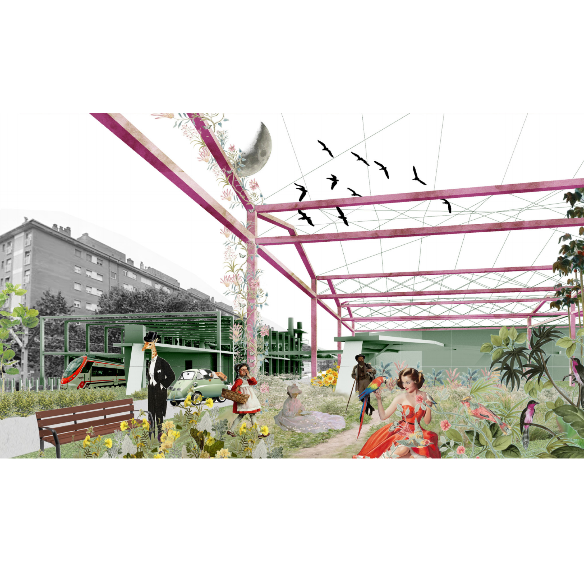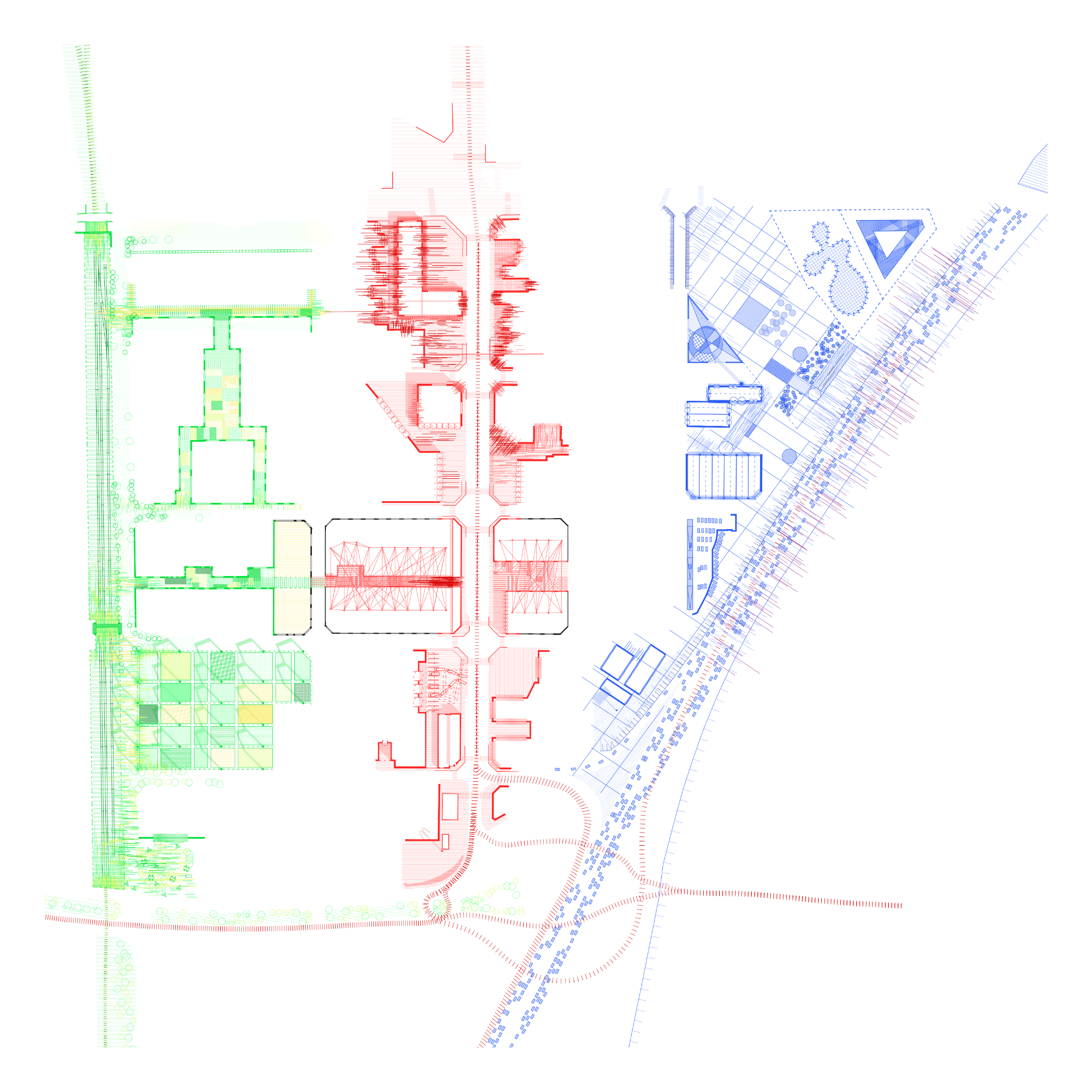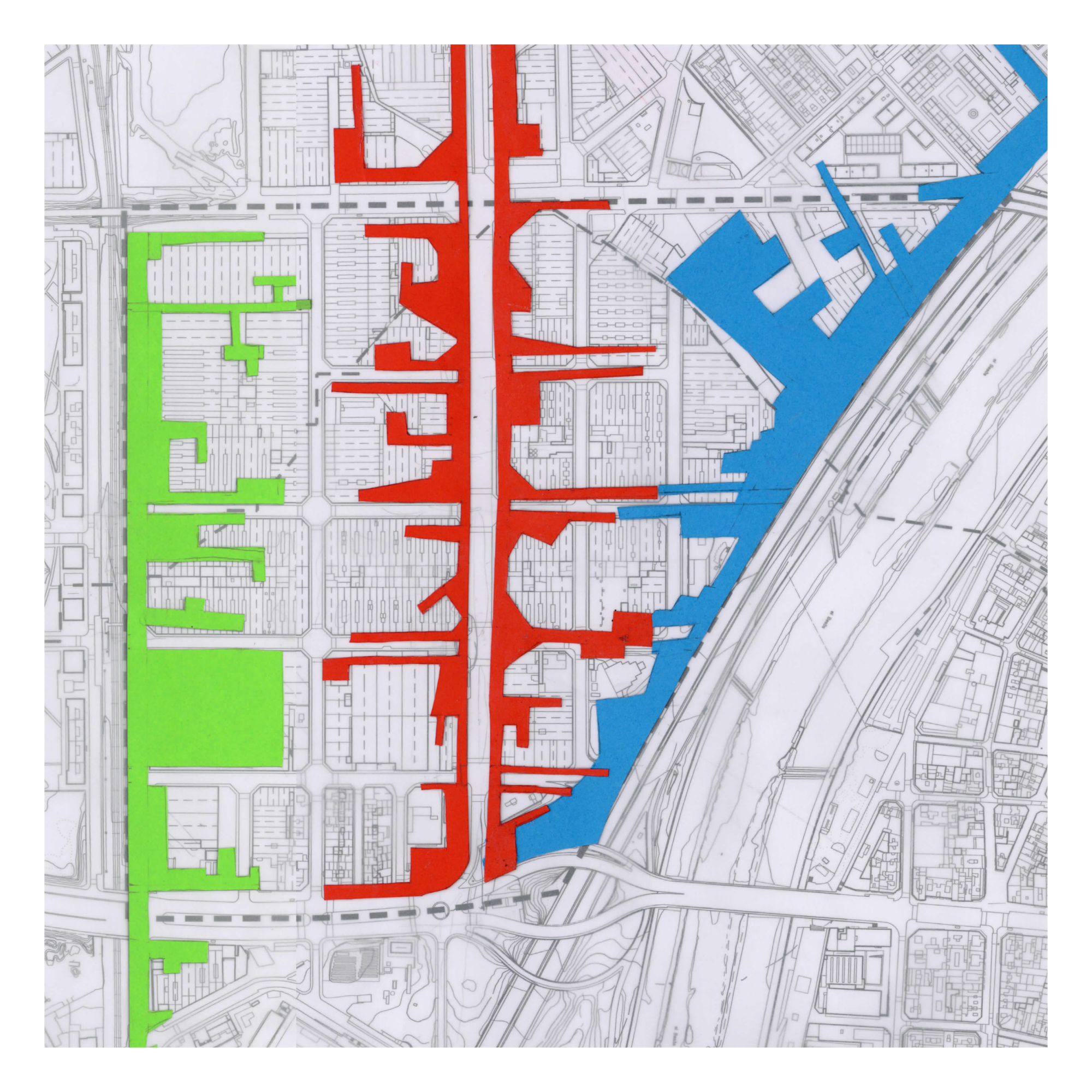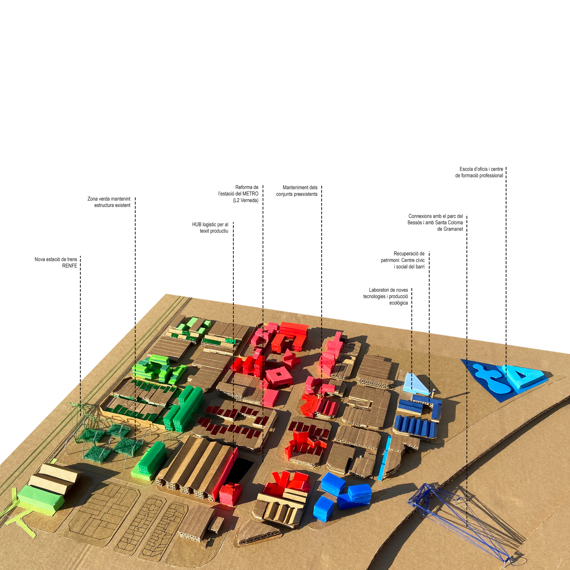 La proposta es fonamenta en una lectura atenta de l’entorn existent, especialment de les empremtes deixades pels conjunts industrials i la xarxa viària actual. A partir d’aquesta anàlisi, el projecte RGB estructura la intervenció mitjançant la domesticació de tres eixos verticals clau —el carrer del Ferrocarril, el carrer Balmes i la Ronda Litoral—, als quals s’assigna un caràcter específic associat simbòlicament als colors vermell, verd i blau. Aquesta estratègia permet diferenciar usos i intensitats, alhora que construeix una lectura clara i coherent del conjunt.