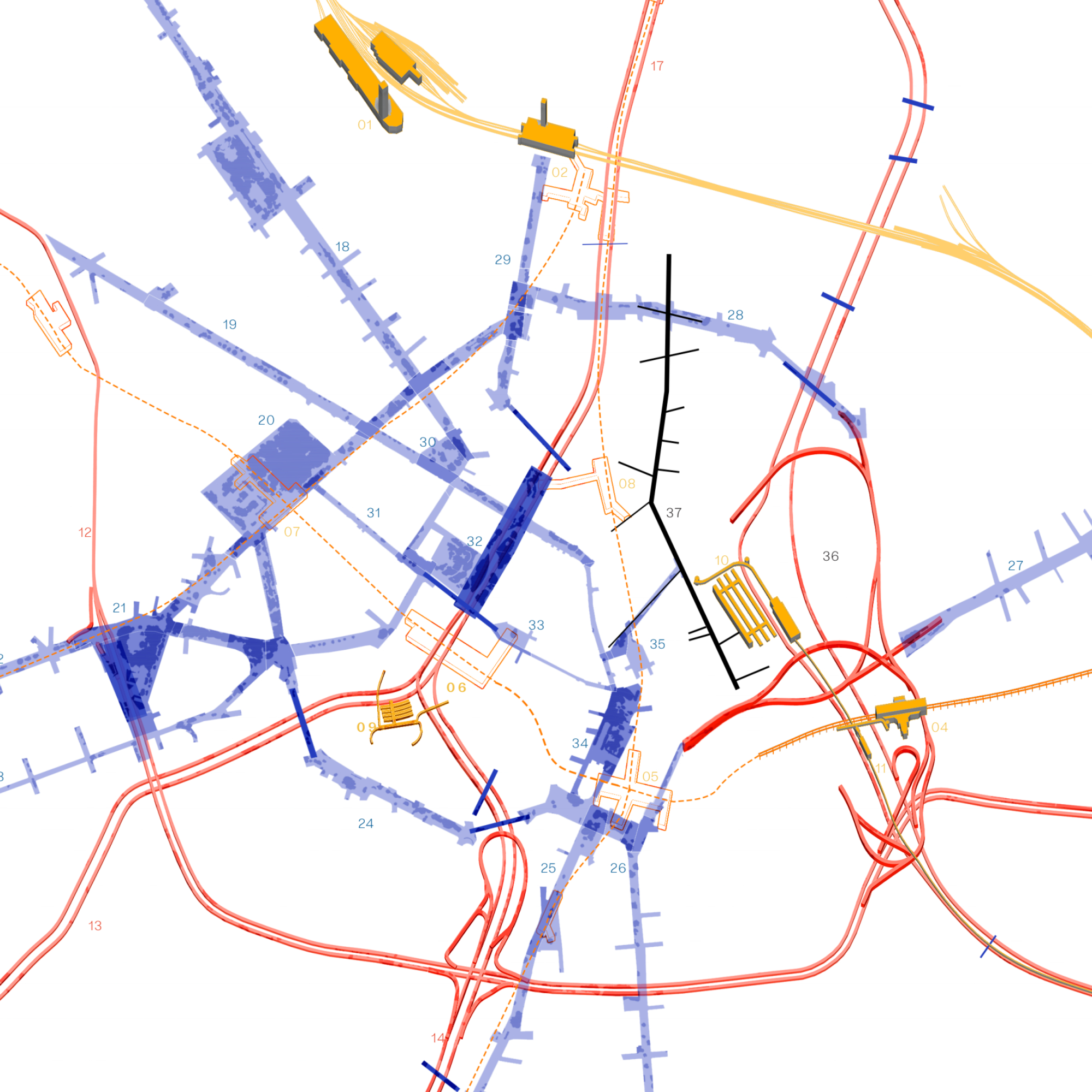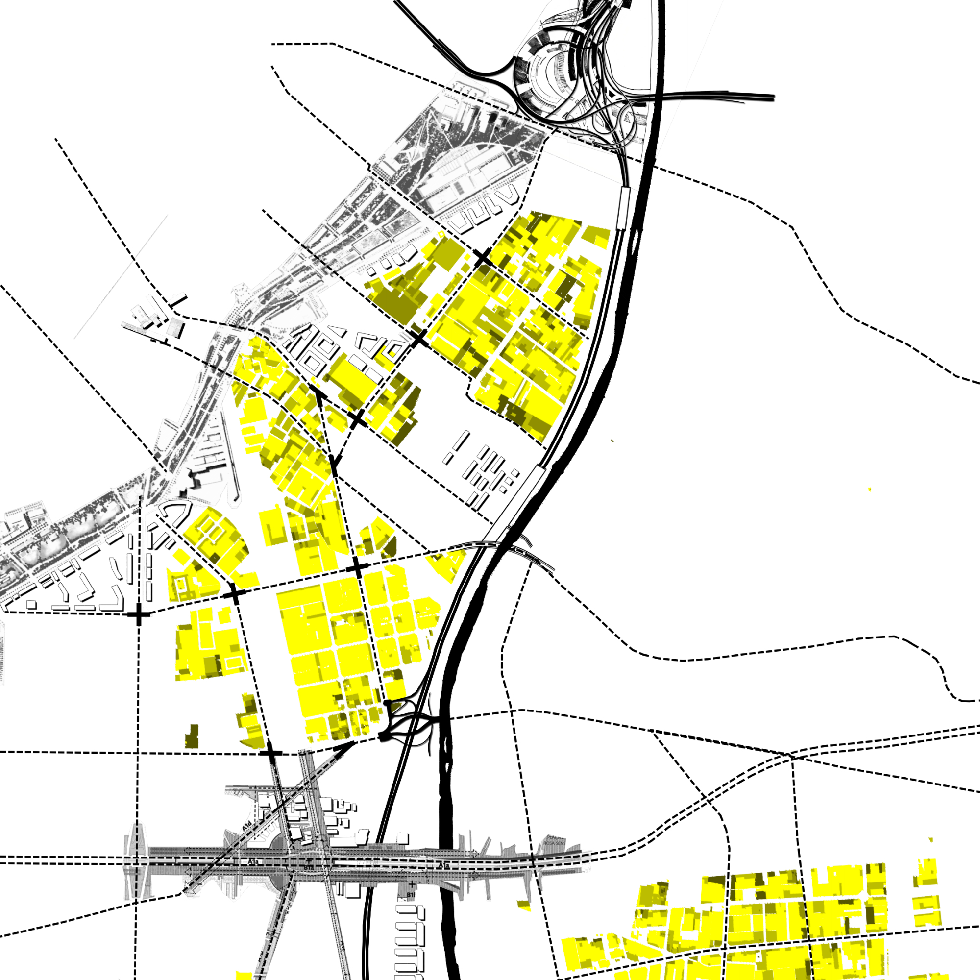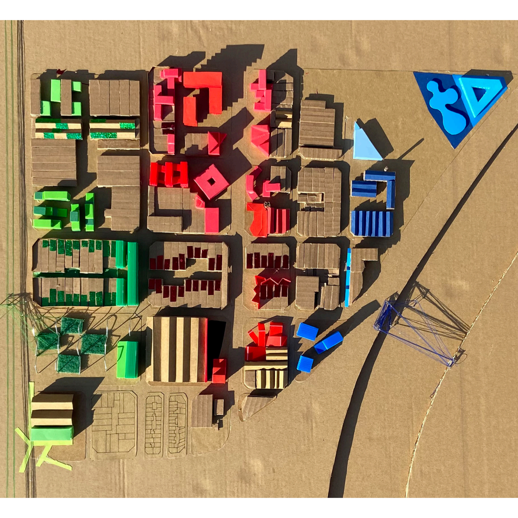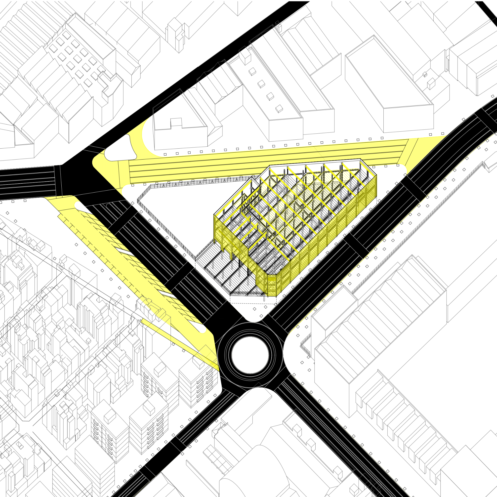 La proposta es fonamenta en una lectura atenta de l’entorn existent, especialment de les empremtes deixades pels conjunts industrials i la xarxa viària actual. A partir d’aquesta anàlisi, el projecte RGB estructura la intervenció mitjançant la domesticació de tres eixos verticals clau —el carrer del Ferrocarril, el carrer Balmes i la Ronda Litoral—, als quals s’assigna un caràcter específic associat simbòlicament als colors vermell, verd i blau. Aquesta estratègia permet diferenciar usos i intensitats, alhora que construeix una lectura clara i coherent del conjunt.