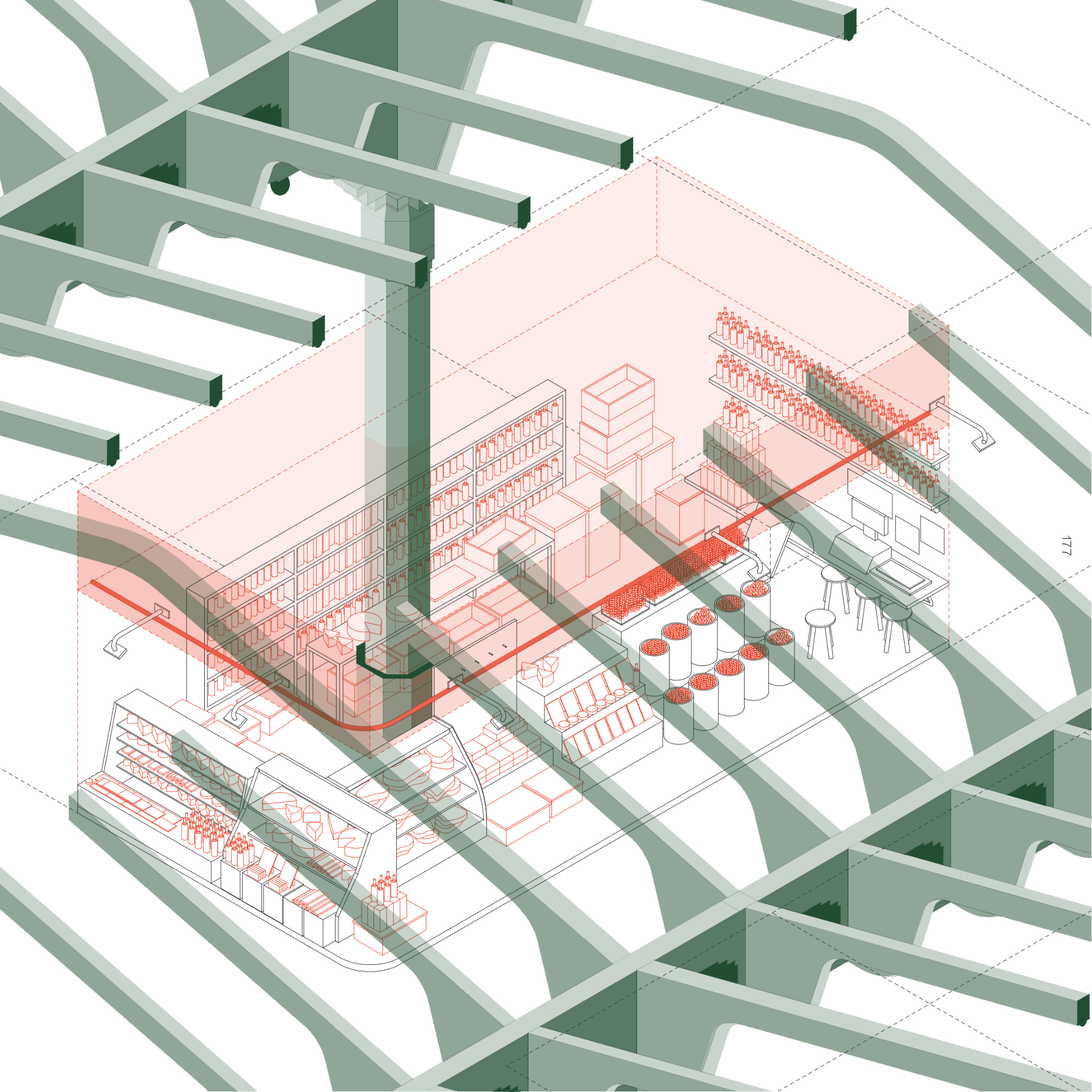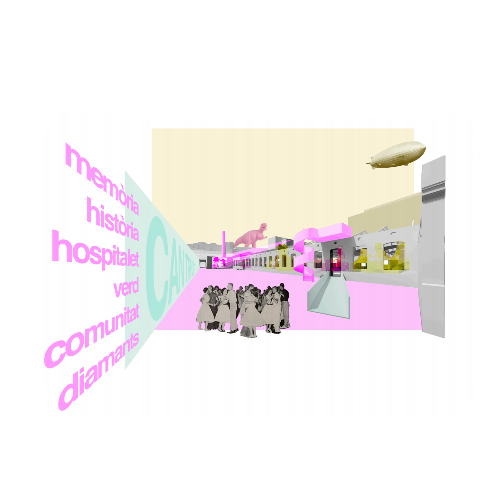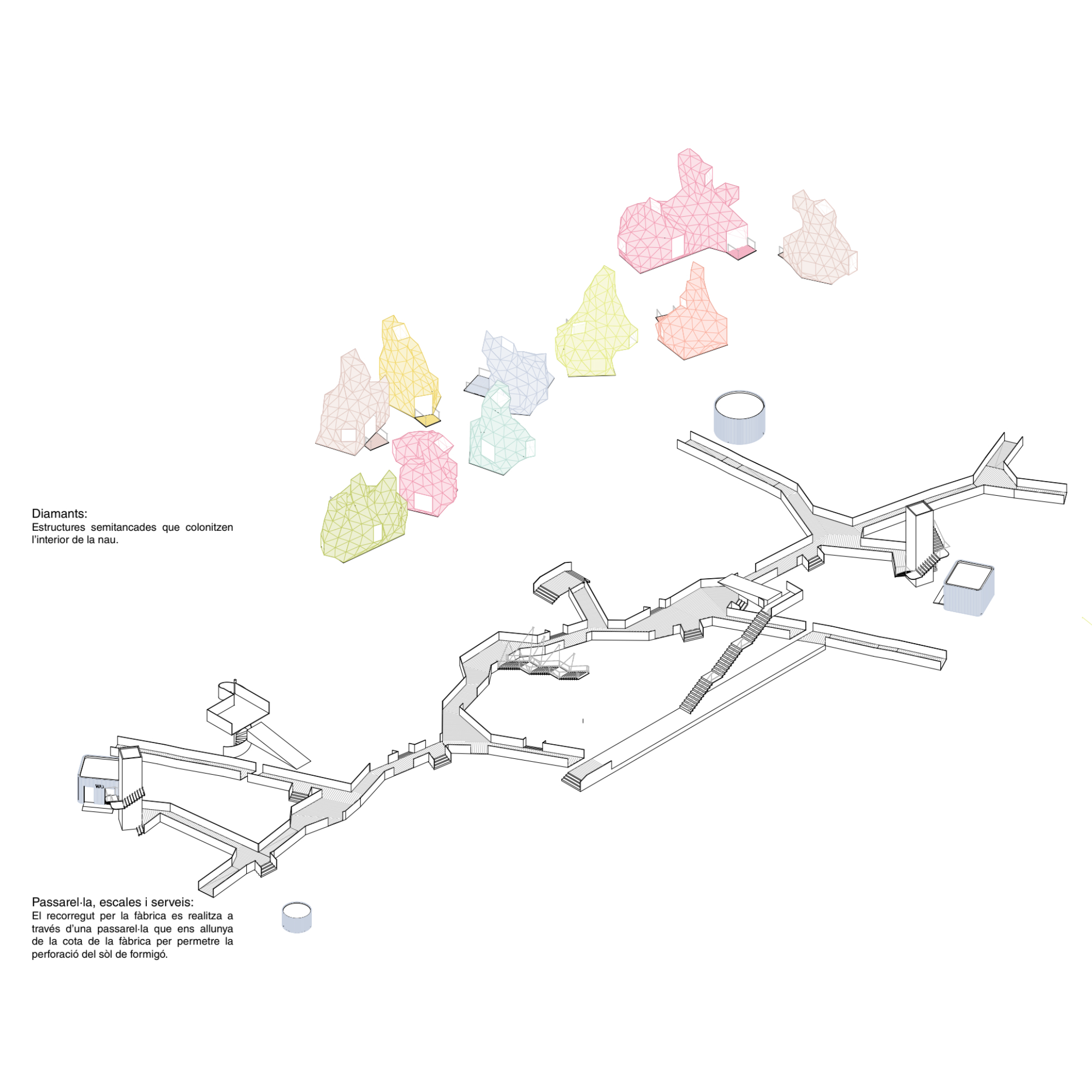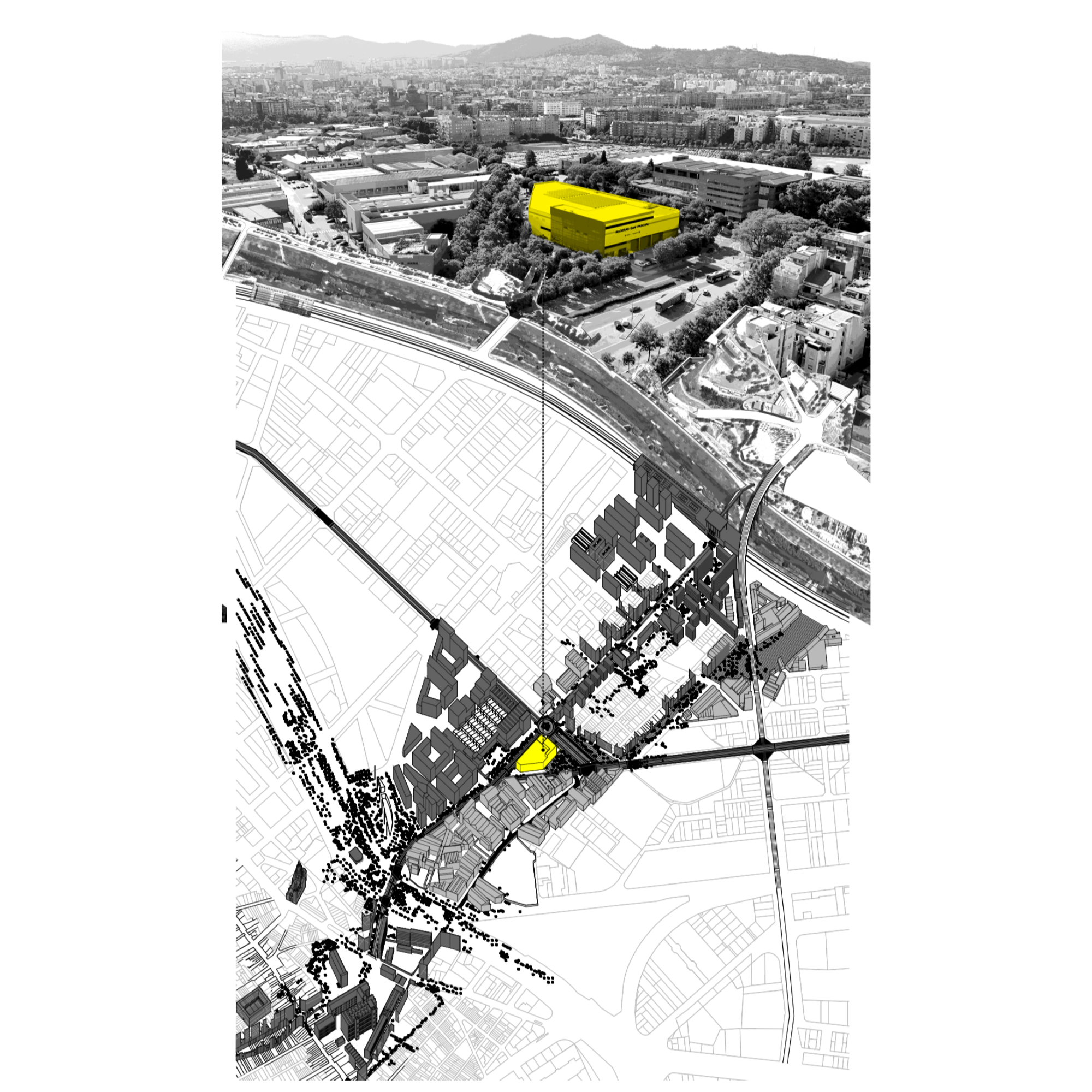 La proposta entén que la nau industrial pot evolucionar més enllà del seu ús original, esdevenint un equipament híbrid on conviuen la producció —reinterpretada amb tallers, laboratoris i espais d’innovació— amb nous programes: formació, habitatge, comerç i serveis de proximitat. Aquesta mixicitat funcional permet que l’activitat industrial perdi el seu caràcter exclusiu i passi a formar part d’un ecosistema més ampli, connectat amb la vida quotidiana del barri i amb la ciutat metropolitana. El projecte es relaciona de manera directa amb els eixos històrics que condueixen cap al riu, recuperant els antics camins i torrents com a connectors urbans.