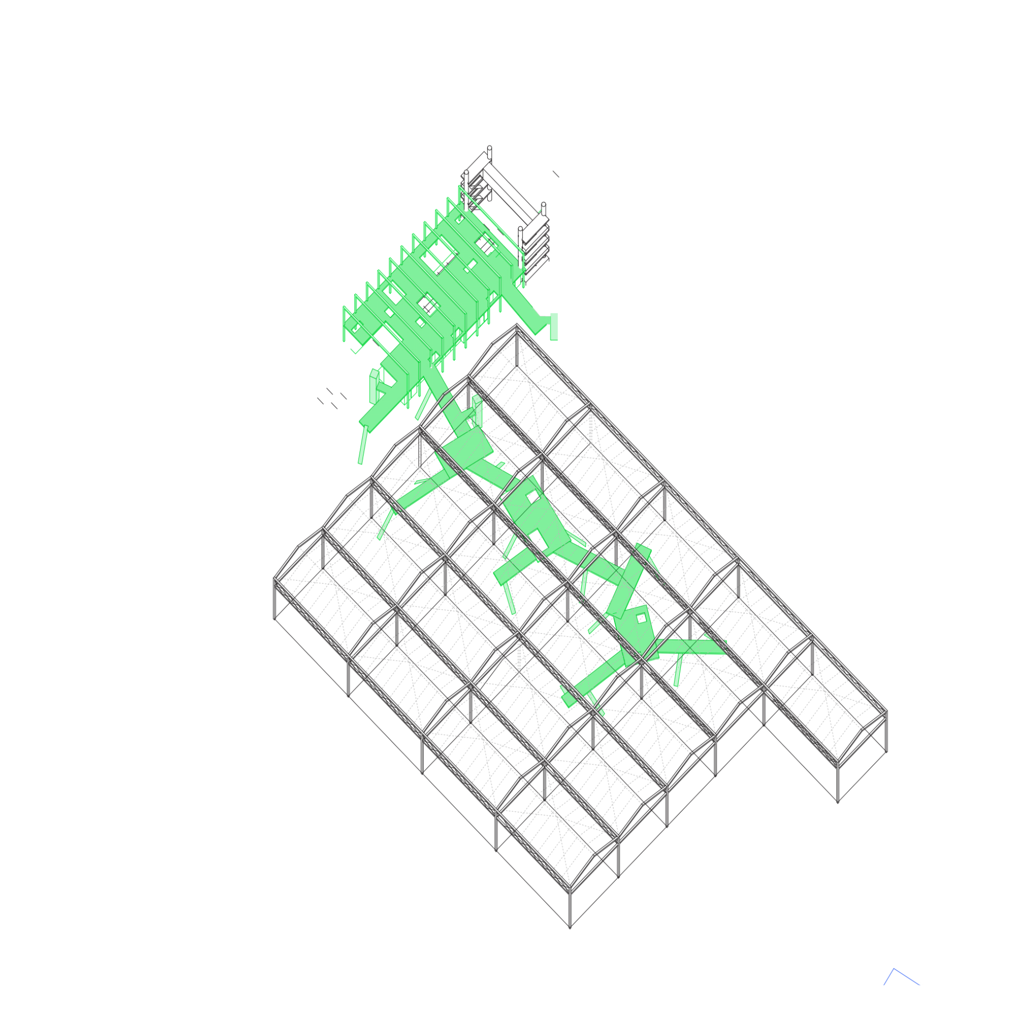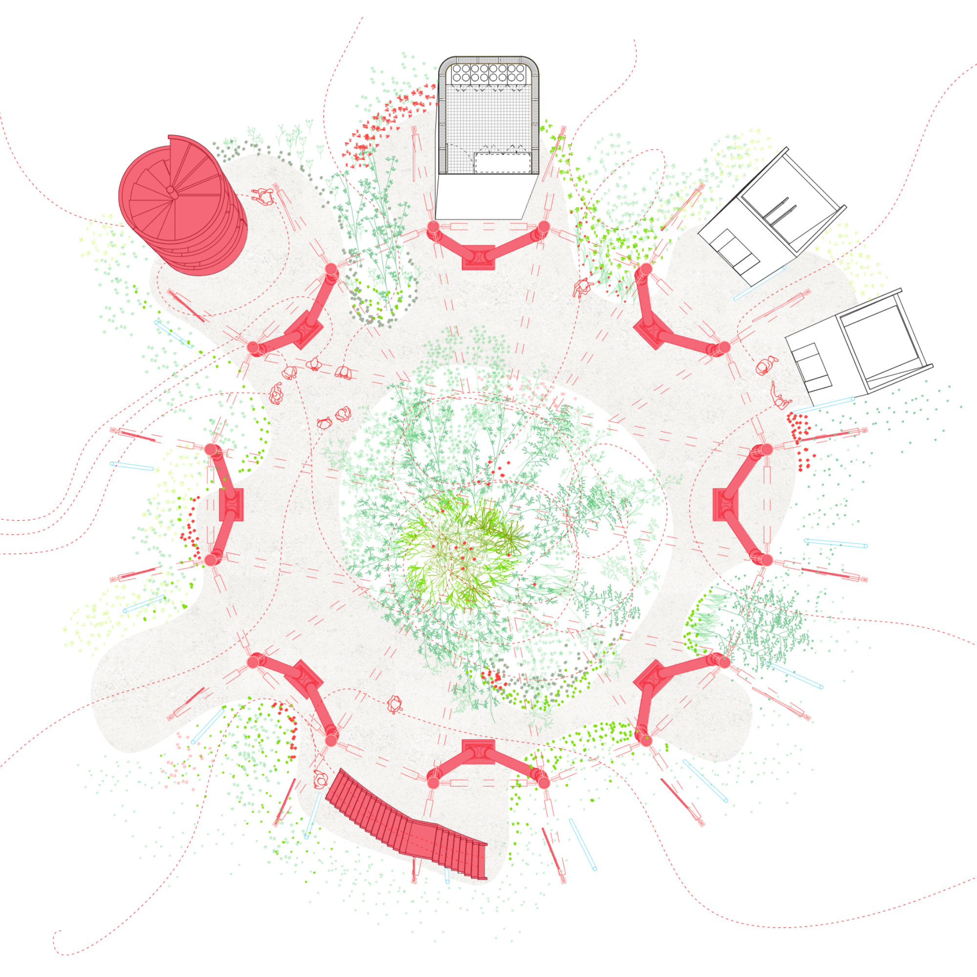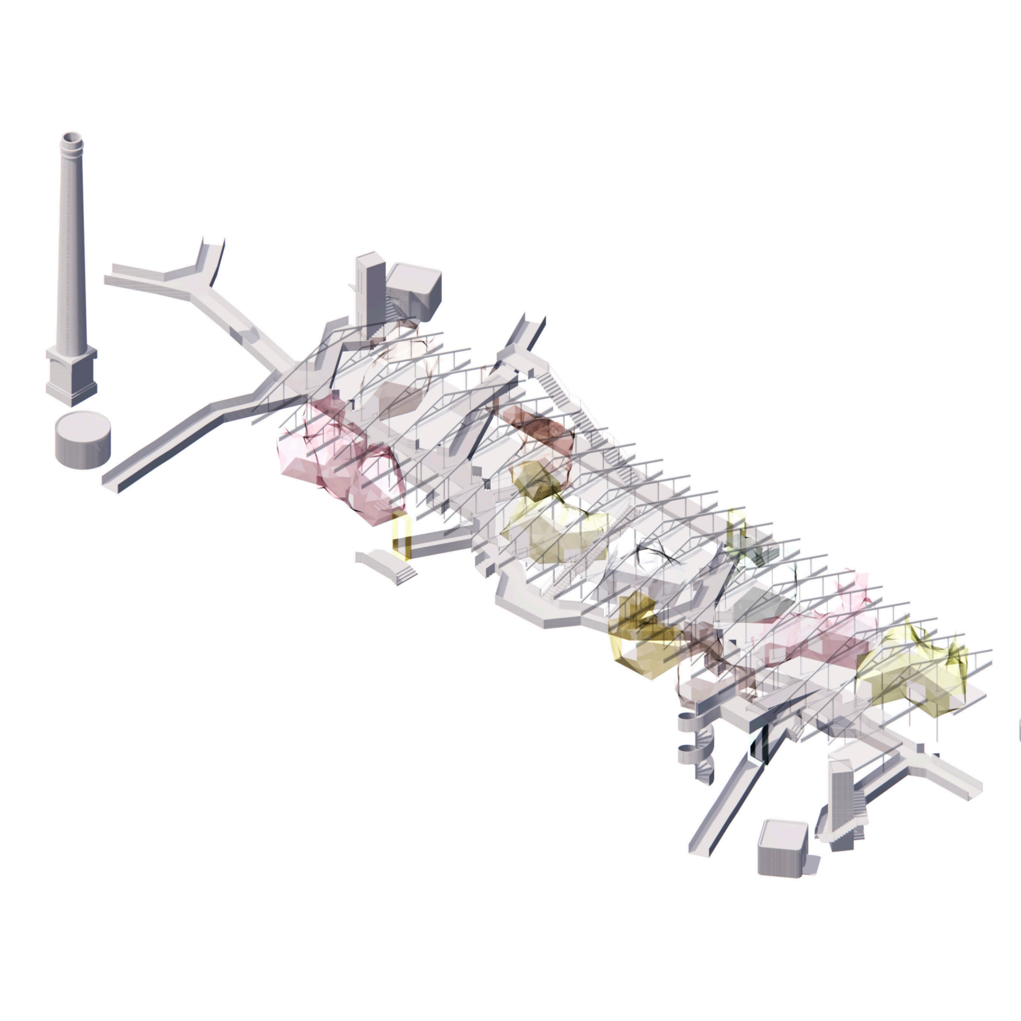 La proposta entén que la nau industrial pot evolucionar més enllà del seu ús original, esdevenint un equipament híbrid on conviuen la producció —reinterpretada amb tallers, laboratoris i espais d’innovació— amb nous programes: formació, habitatge, comerç i serveis de proximitat. Aquesta mixicitat funcional permet que l’activitat industrial perdi el seu caràcter exclusiu i passi a formar part d’un ecosistema més ampli, connectat amb la vida quotidiana del barri i amb la ciutat metropolitana. El projecte es relaciona de manera directa amb els eixos històrics que condueixen cap al riu, recuperant els antics camins i torrents com a connectors urbans.