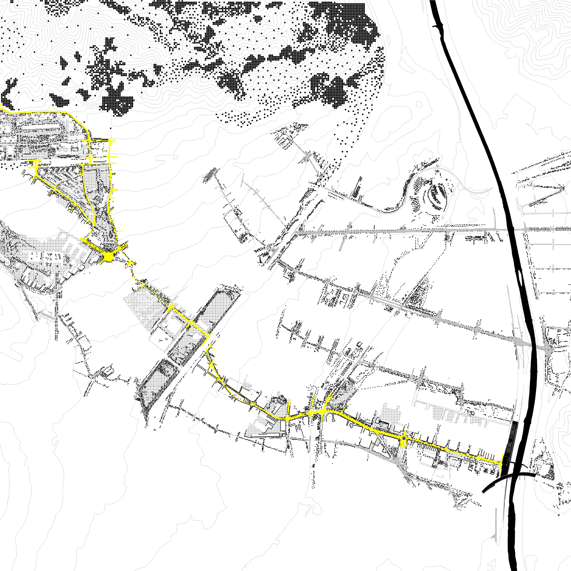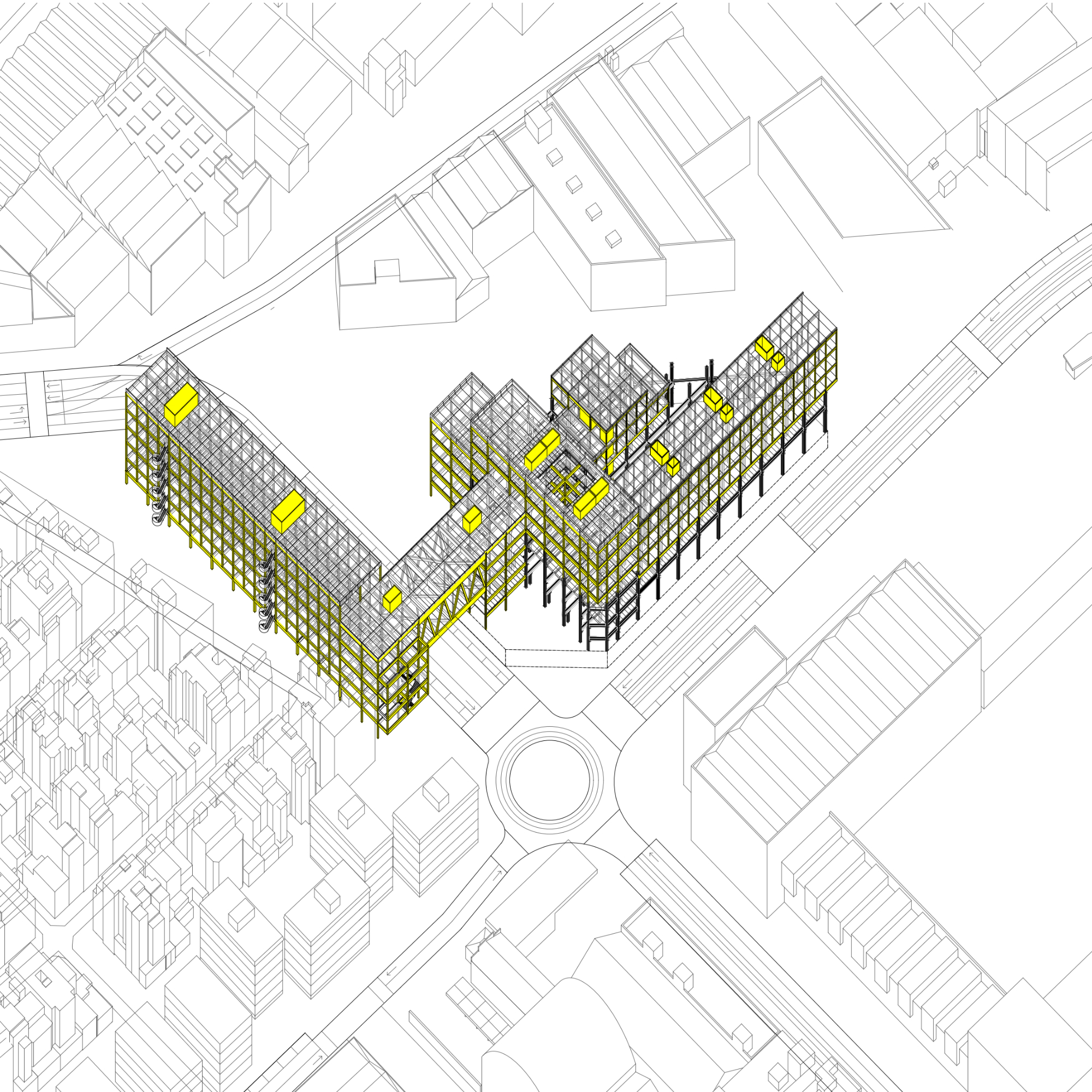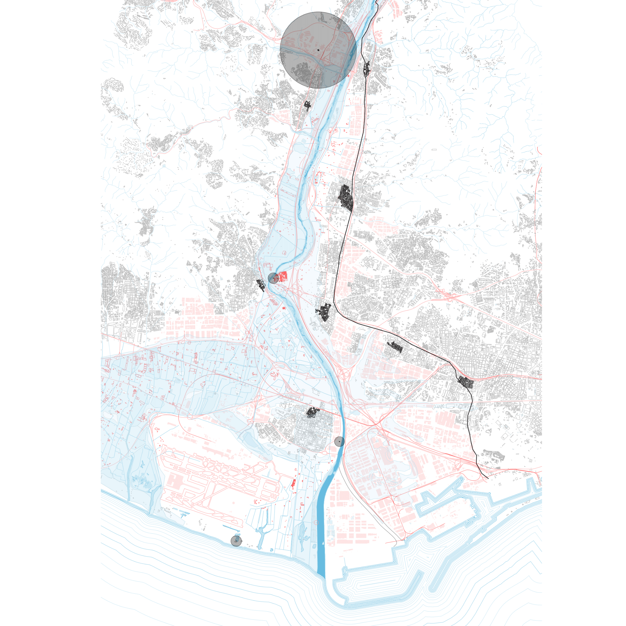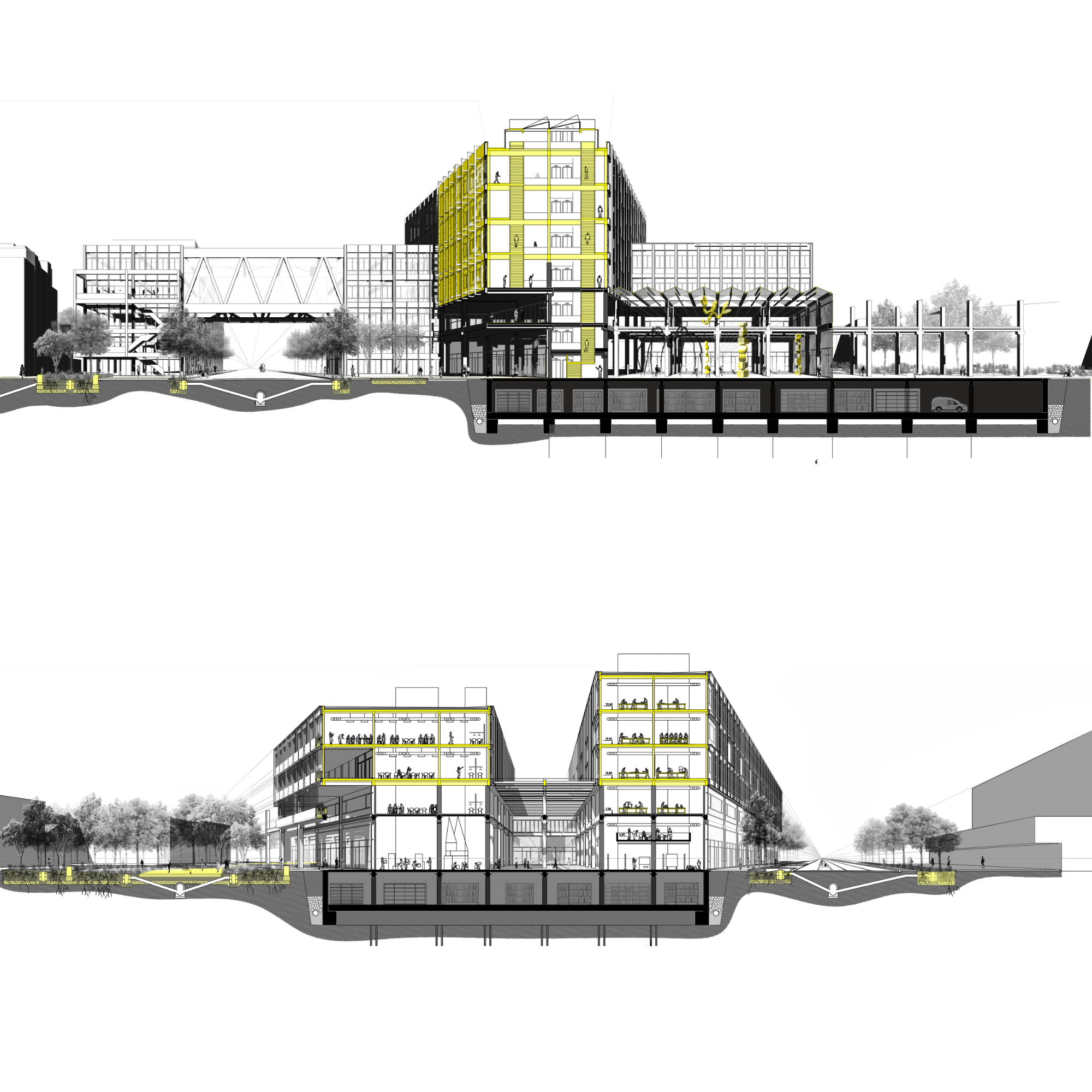 La proposta entén que la nau industrial pot evolucionar més enllà del seu ús original, esdevenint un equipament híbrid on conviuen la producció —reinterpretada amb tallers, laboratoris i espais d’innovació— amb nous programes: formació, habitatge, comerç i serveis de proximitat. Aquesta mixicitat funcional permet que l’activitat industrial perdi el seu caràcter exclusiu i passi a formar part d’un ecosistema més ampli, connectat amb la vida quotidiana del barri i amb la ciutat metropolitana. El projecte es relaciona de manera directa amb els eixos històrics que condueixen cap al riu, recuperant els antics camins i torrents com a connectors urbans.