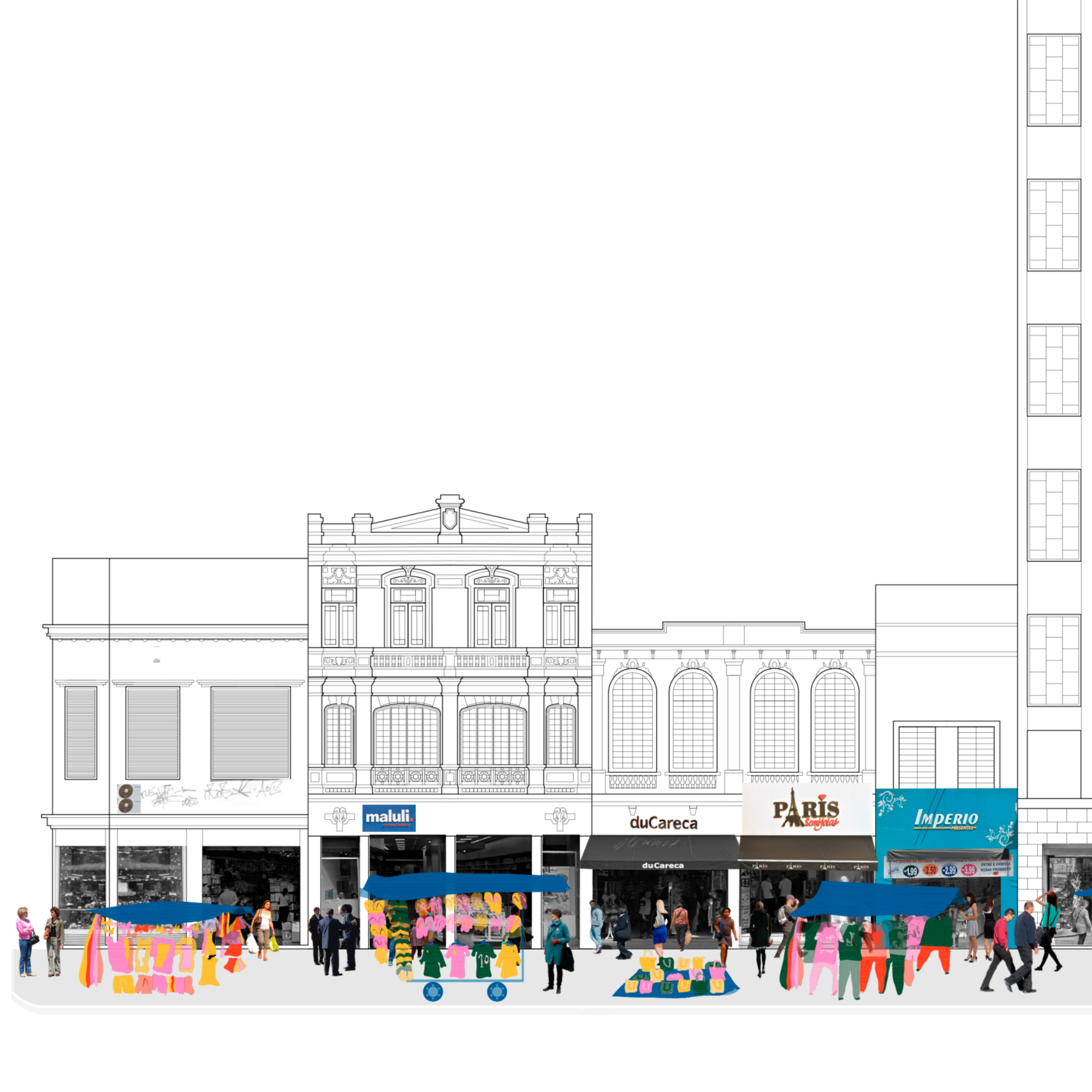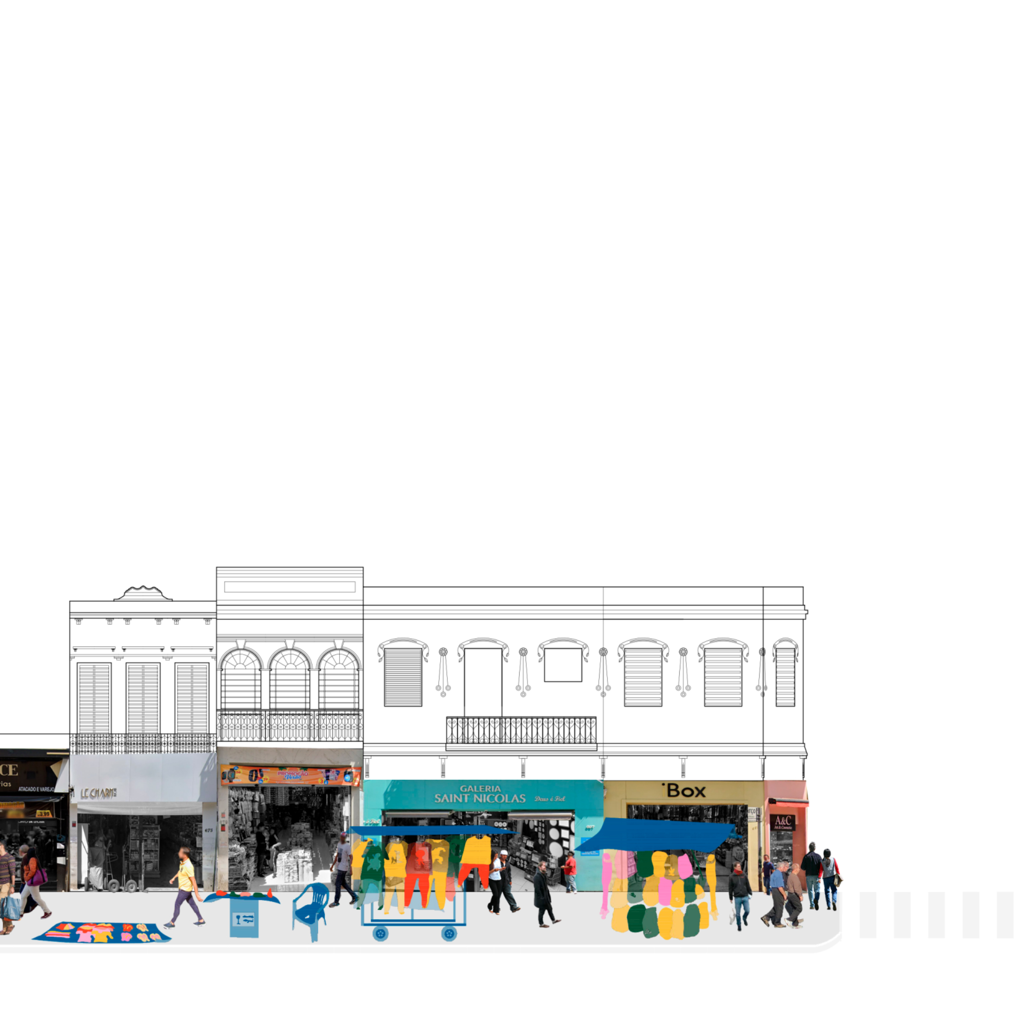 Posteriorment, el treball aprofundeix en l’estudi de quatre tipologies comercials presents a la Rua 25 de Março —la botiga, el mercat, la galeria comercial i el comerç ambulant—, explorant la manera com aquestes interactuen amb l’espai arquitectònic, la dinàmica urbana i les relacions que s’estableixen entre elles.