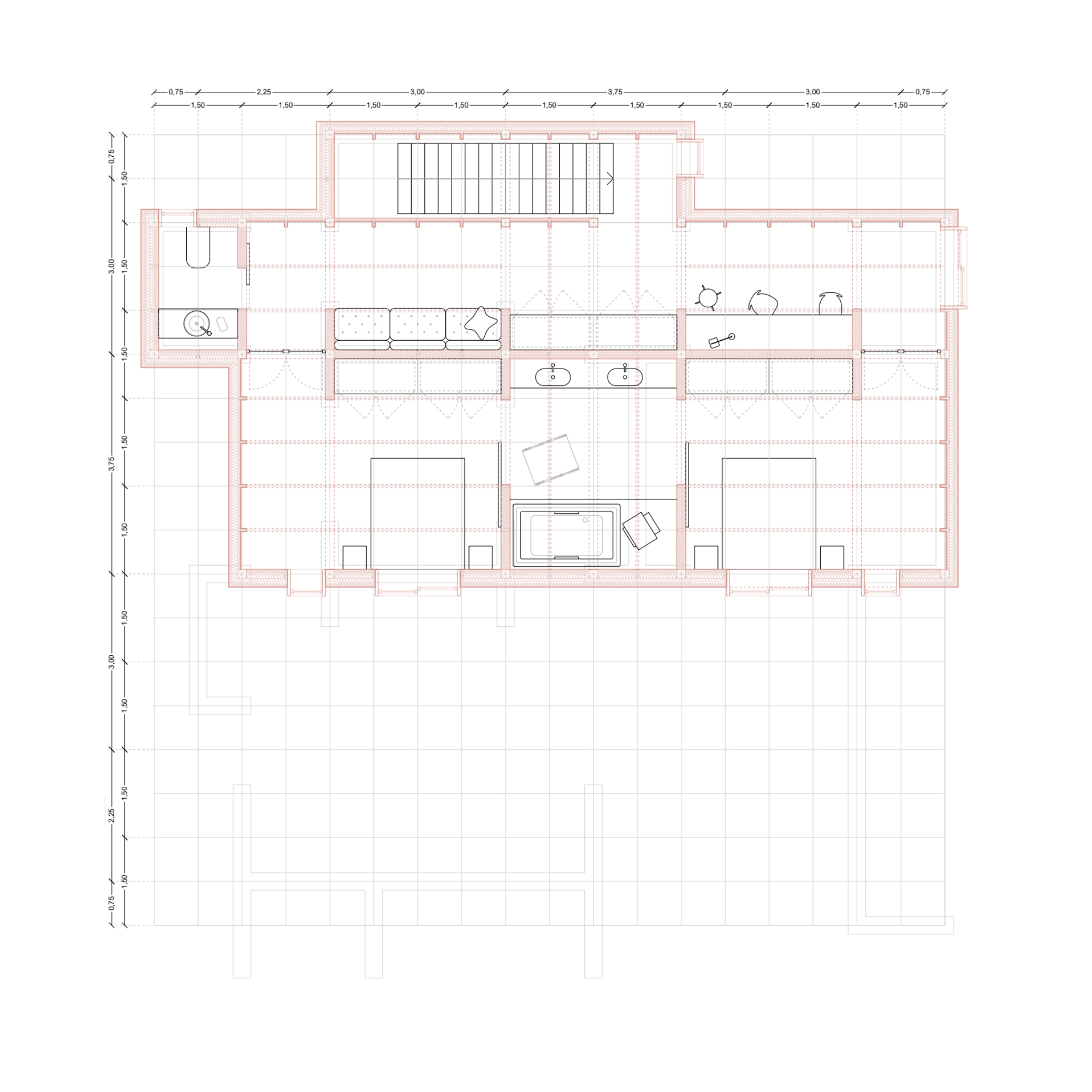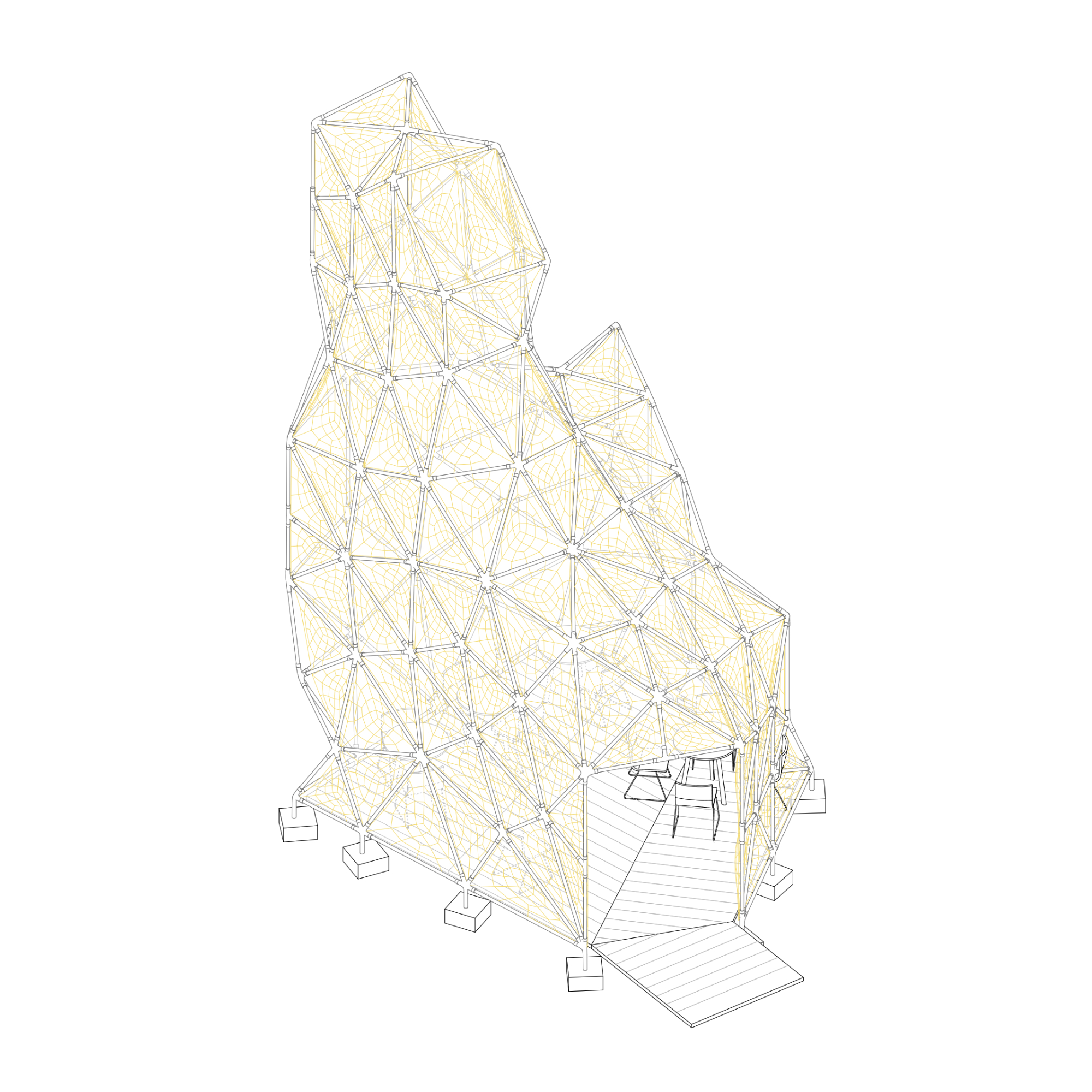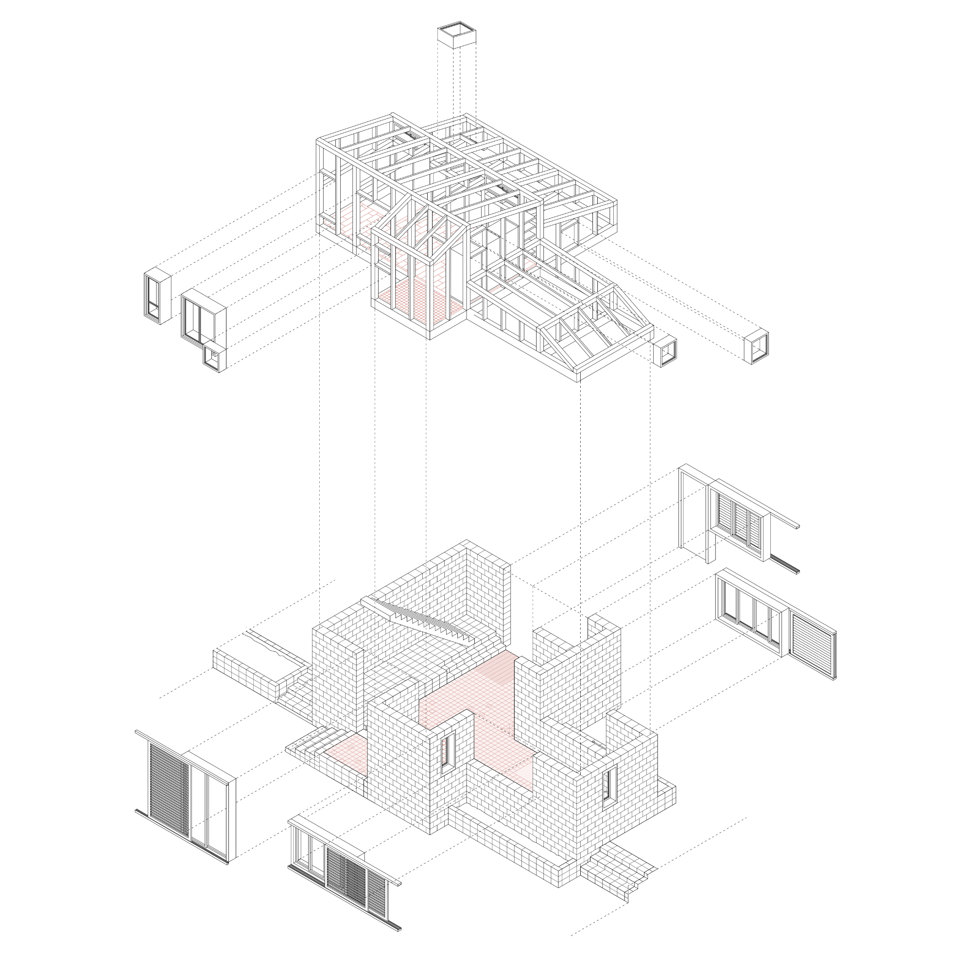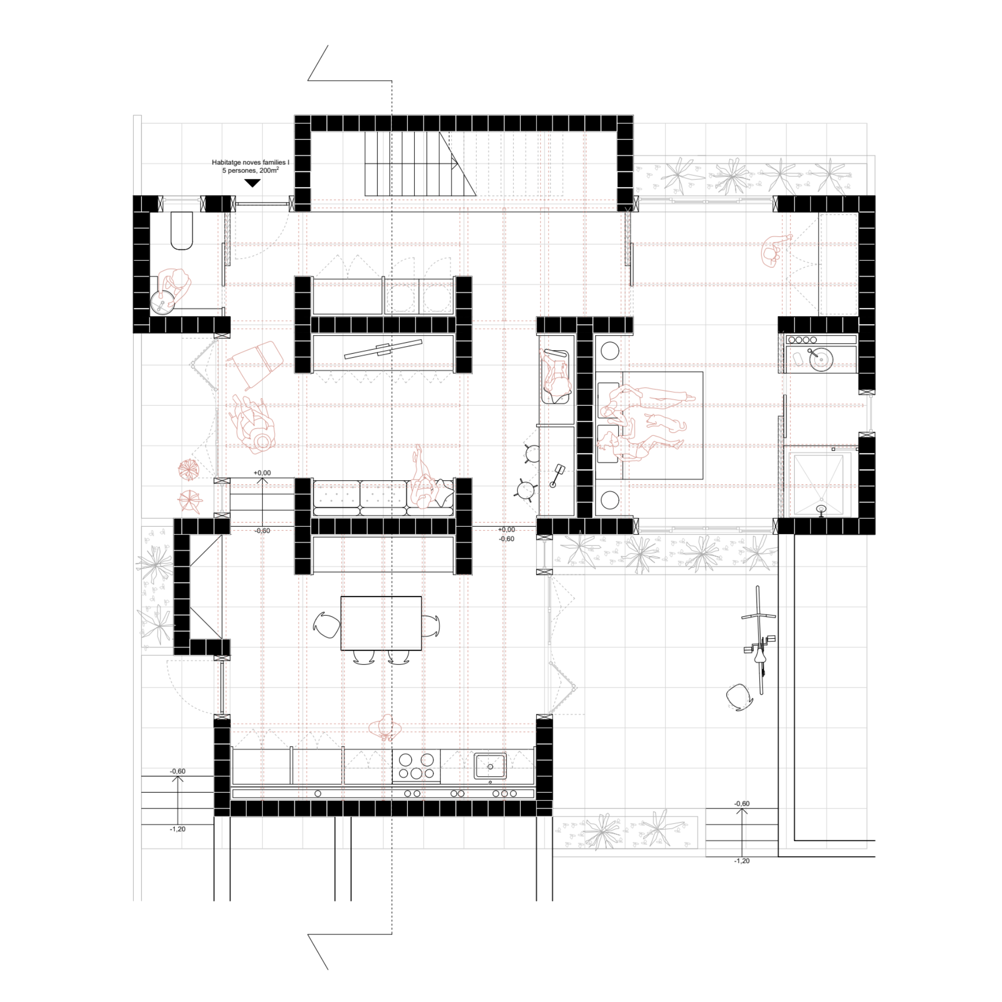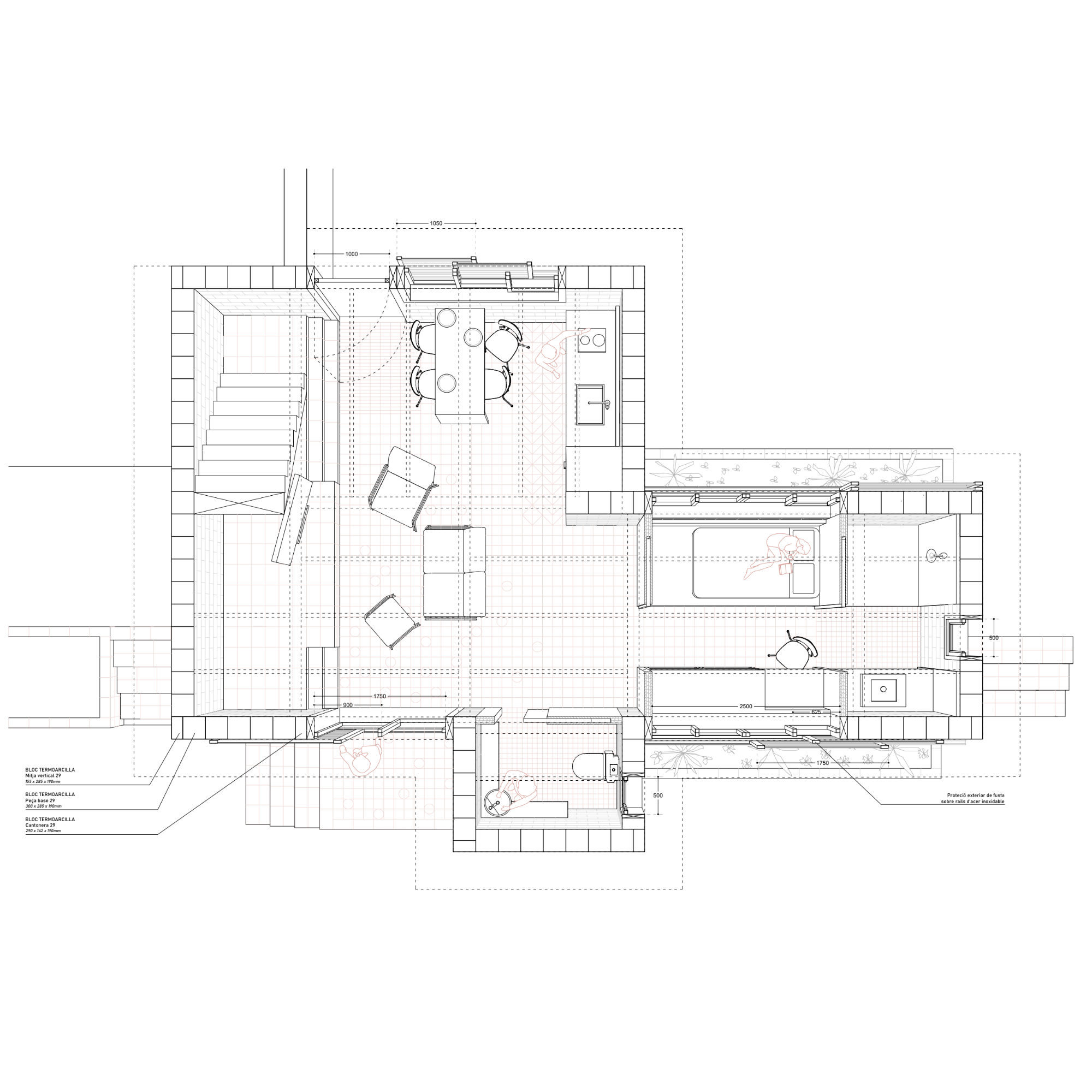 L’organització espacial es construeix a partir de la disposició de nuclis durs de termoargila que concentren els principals serveis de l’habitatge. Aquests elements actuen com a peces estructuradores que ordenen la parcel·la, defineixen els recorreguts i donen suport a una arquitectura més oberta i adaptable, capaç d’evolucionar amb les necessitats de les diferents unitats familiars.