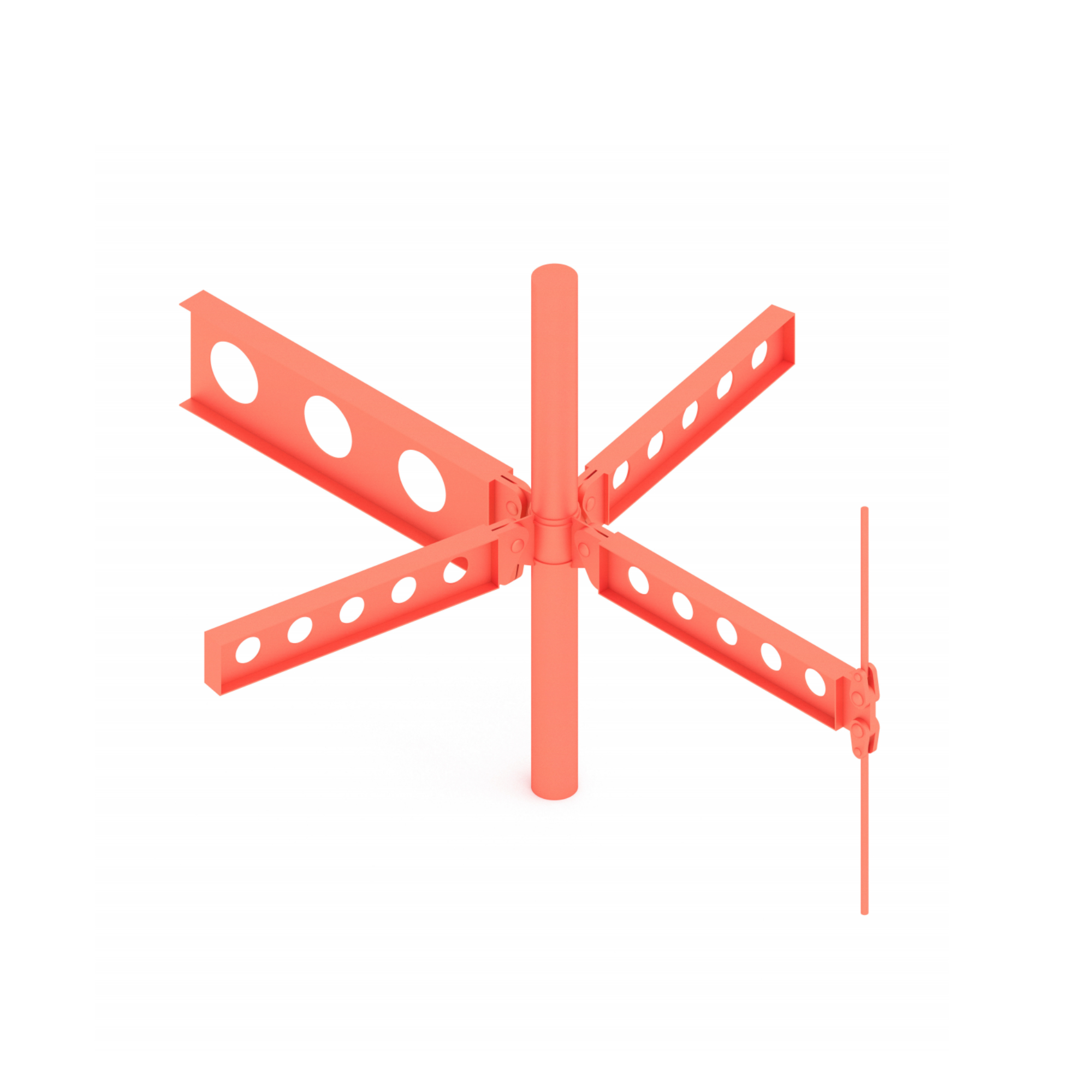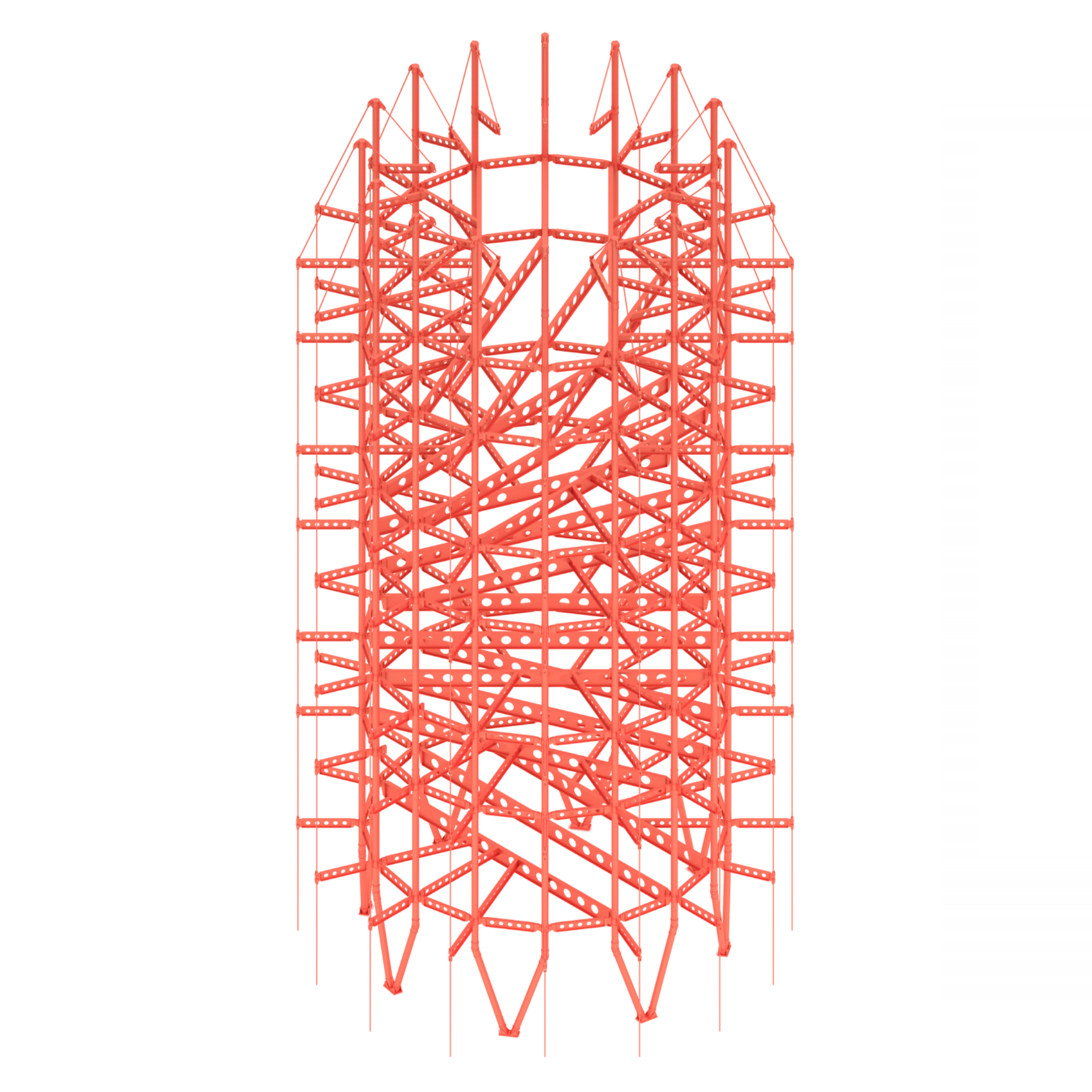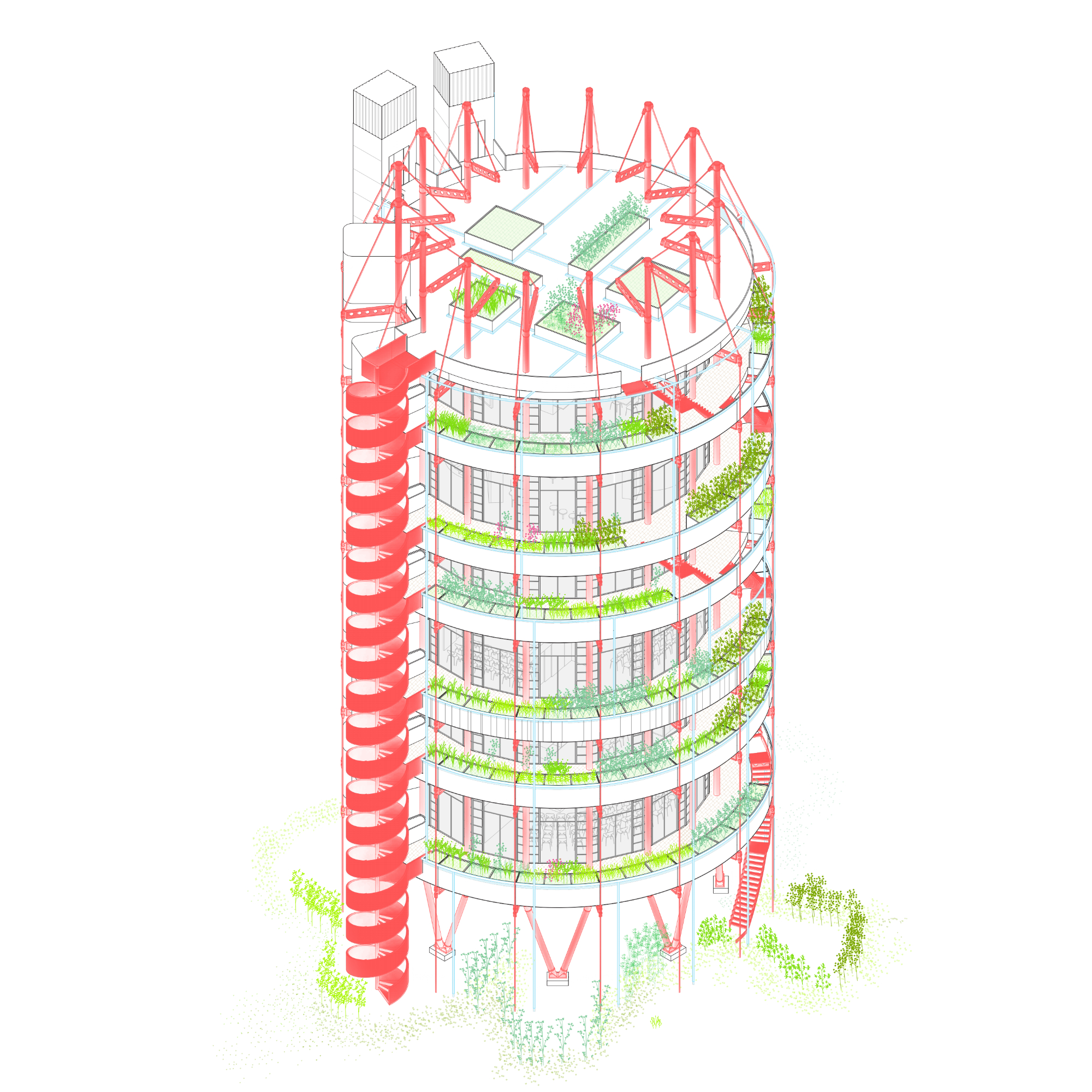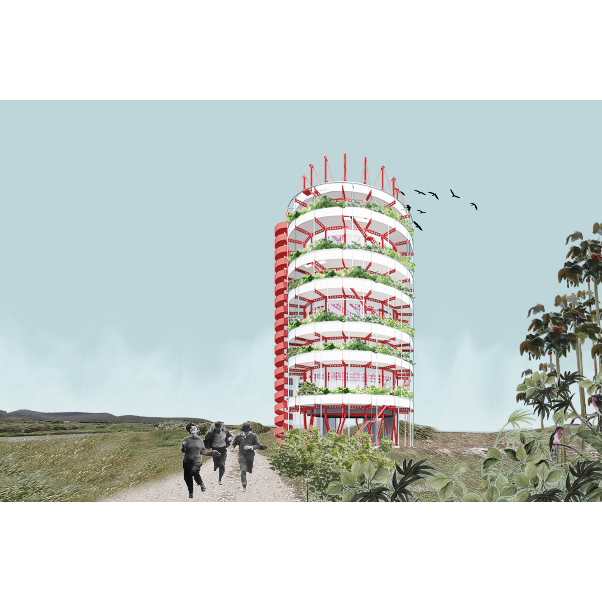 El projecte mostra un interès específic en el disseny de l’estructura com a element expressiu, situada a l’exterior i resolta amb un color vermell que estableix un fort contrast amb el verd del paisatge agrícola. L’edifici s’organitza a partir d’una planta de 200 m² i es desenvolupa en sis nivells, configurant una peça vertical clara i recognoscible dins de l’horitzó del territori.