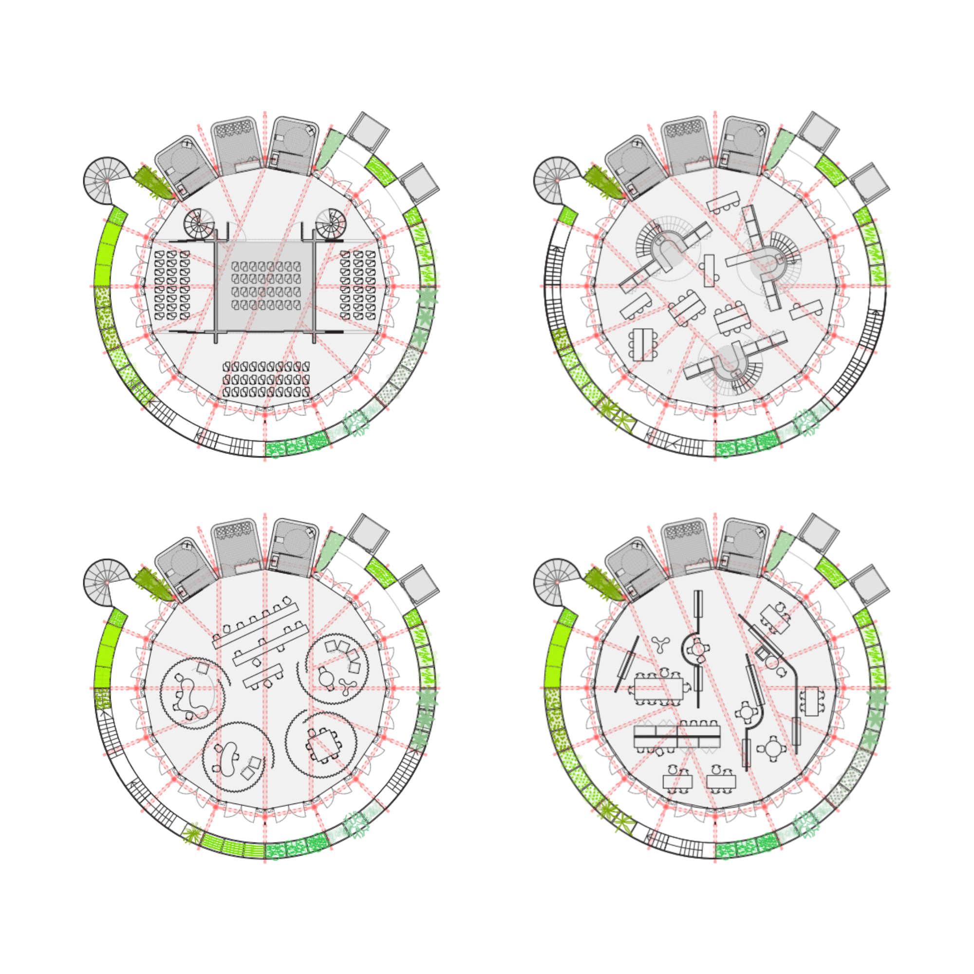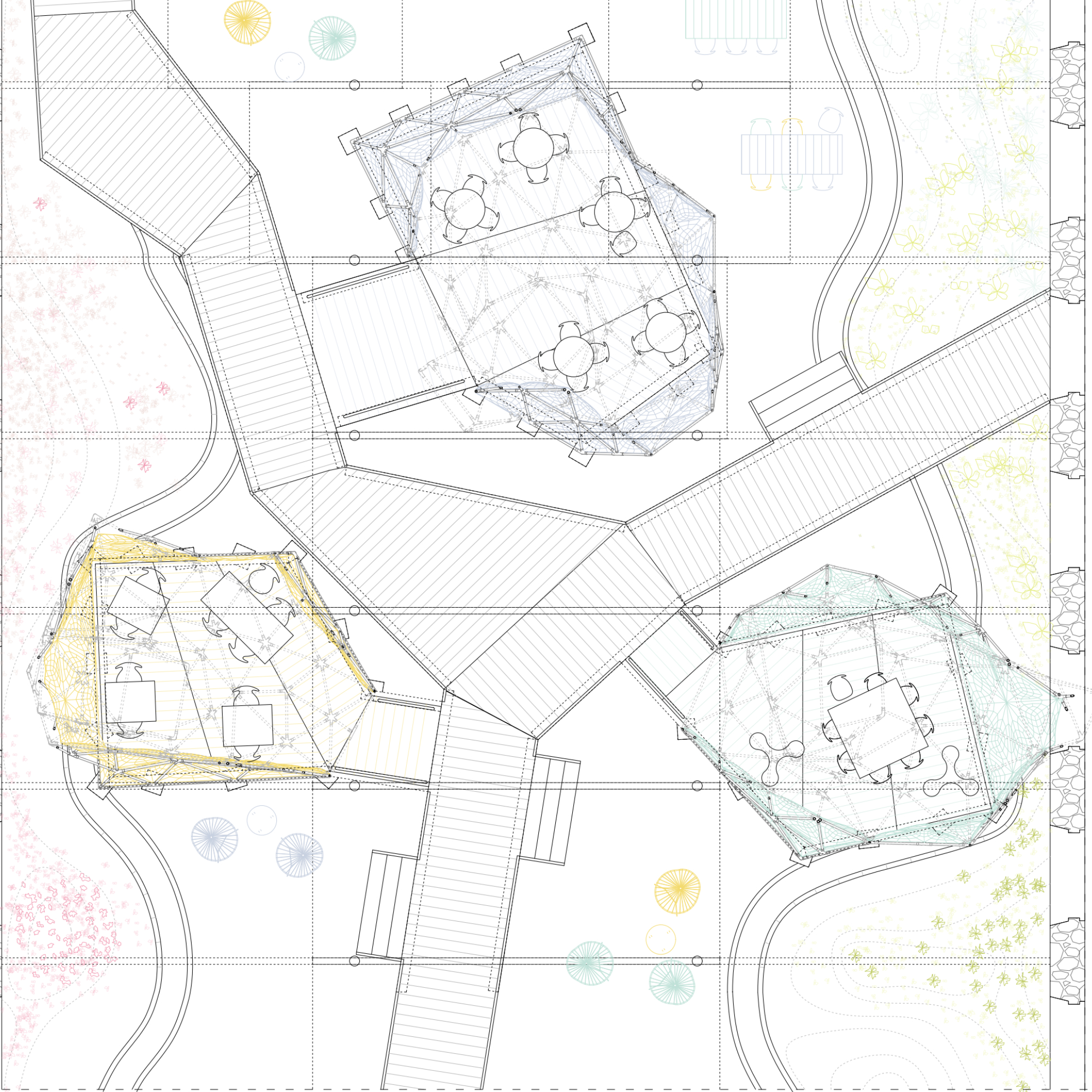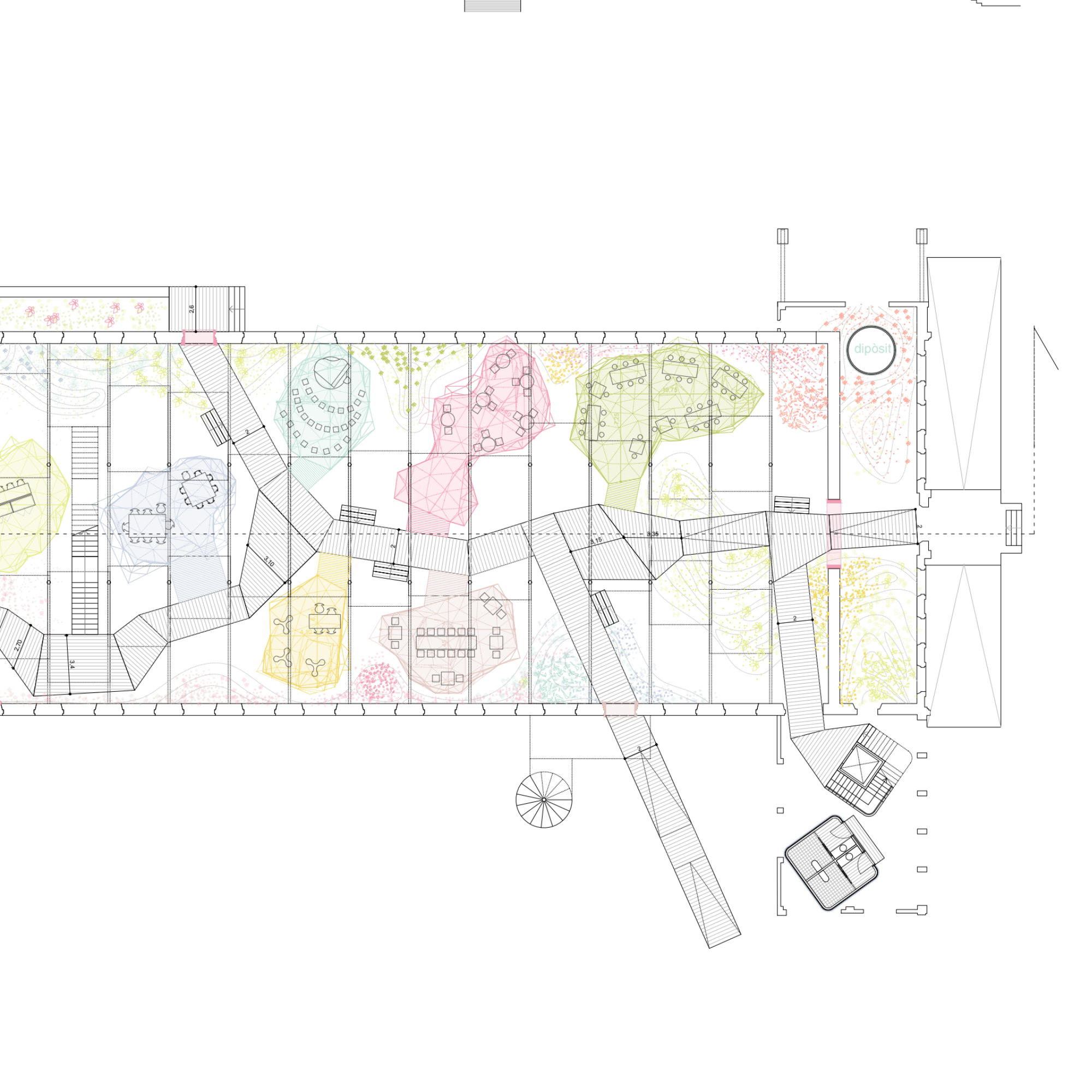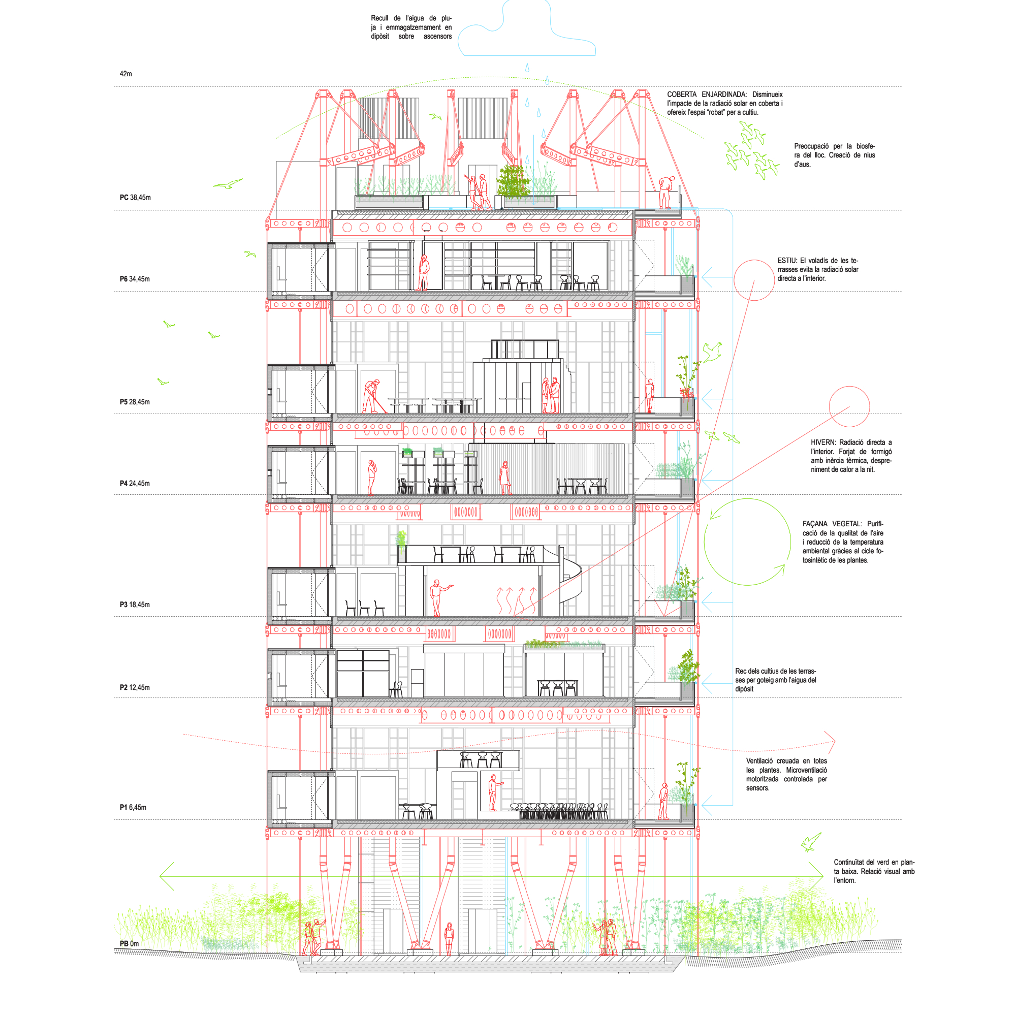 La planta baixa es concep com un espai lliure i sense programa interior, que garanteix la continuïtat del verd i permet la inundabilitat del terreny en cas de pluja sense afectar l’interior de l’edifici. Aquesta estratègia respon tant a criteris ambientals com a una voluntat d’integració amb les dinàmiques naturals del delta.